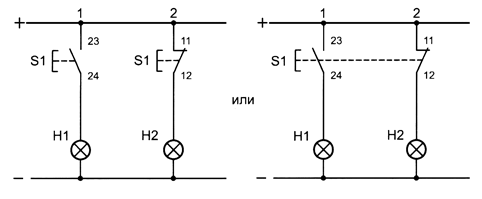 В случаях, когда выключатели имеют несколько контактных групп, клеммы контактов обозначают двузначным числом, первая цифра которого указывает на порядковый номер контактной группы в данном устройстве, а вторая — на тип контакта (см. рис. 2.3, б). Если контакты подобного выключателя задействованы в разных цепях, то на схеме допускается изображение механической связи между ними (рис. 2.5).