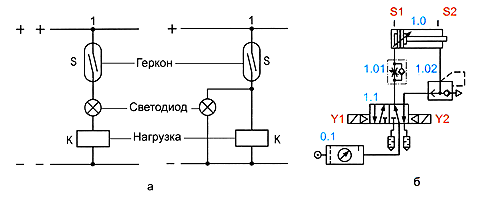 Рис. 2.9. Двух- и трехпроводные схемы включения герконовых выключателей и их изображение на принципиальных пневматических схемах