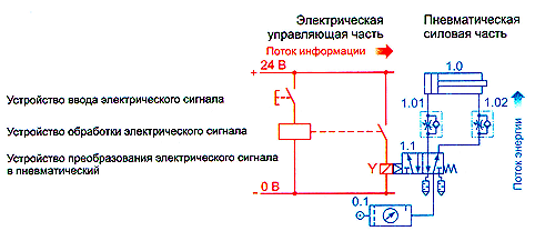 В электропневматических системах силовая часть выполненяется на пневматической элементной базе, а управляющая — на электрической. В таких системах сочетаются высокие скорости перемещений исполнительных механизмов, высокие скорости формирования и обработки управляющих электрических сигналов, простота регулирования развиваемых усилий, высокая взаимозаменяемость информационных и коммутирующих электрических элементов.