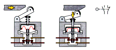 В электромеханических путевых выключателях коммутация контактов осуществляется при механическом воздействии контролируемого объекта на чувствительный элемент (рис. 2.6).