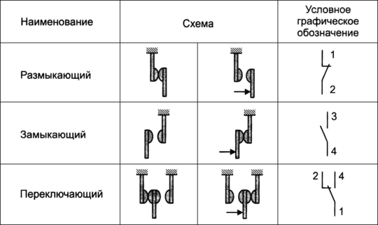 Основными конструктивными элементами этих устройств являются контактная система (состоящая из подвижныx и неподвижных контакт-элементов) и привод. Электрические контакты делятся по функциональному назначению на замыкающие, размыкающие и переключающие (рис. 2.2).