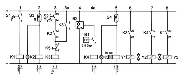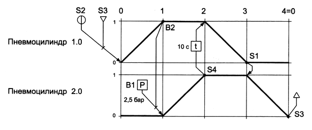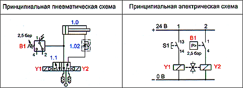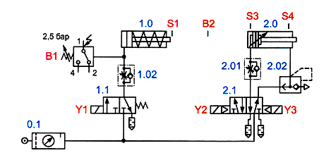 При кратковременном нажатии на кнопку S1 включается электромагнитный привод Y1 распределителя 1.1 и шток цилиндра 1.0 начинает выдвигаться. После того как шток достигнет крайнего положения, давление в поршневой полости начинает повышаться; когда его значение возрастет до 0,25 МПа (2,5 бар), сработает реле давления В1, что приведет к включению электромагнитного привода Y2 распределителя 1.1. Распределитель переключается, шток цилиндра 1.0 втягивается.