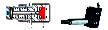 По существу, реле давления представляет собой электрический выключатель 3 с приводом от мини пневмоцилиндра одностороннего действия 2. Значение порога срабатывания реле настраивают посредством регулировочной гайки 1, вращением которой можно изменять силу предварительного поджатия пружины пневмоцилиндра. Настраивая реле, необходимо помнить о различии значений давления, при которых происходит его включение и выключение, вследствие явления гистерезиса пружины.