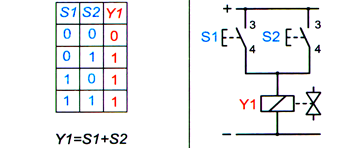 Сигнал на электропривод распределителя Y1 подается в том случае, если нажата хотя бы одна из кнопок S1 или S2.