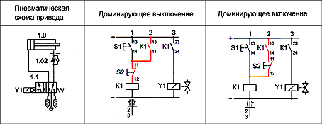 При одновременном нажатии на кнопки S1 и S2 в схеме с доминирующим выключением реле К1 не сработает, т. к. 1-ая цепь окажется разомкнутой, а в схеме с доминирующим включением — сработает, хотя реле и не перейдет в режим самоудержания. Выбор одного из данных схемных решений зависит от требований к функционированию системы в целом.