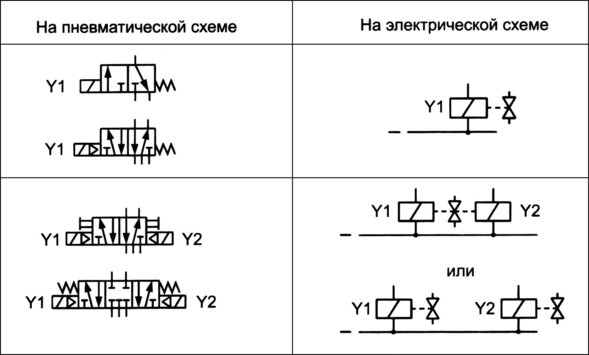 Буквенно-цифровую индексацию (Y1, Y2, Y3,...), присваиваемую электромагнитным приводам распределителей проставляют рядом с их изображениями как на принципиальной пневматической, так и на принципиальной электрической схемах. Тем самым устанавливают однозначную связь между элементами управляющей силовой частей привода.