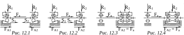 При этом величины FA1(2) определить из условия осевого равновесия вала FA1+FA2+Fa=0. Например, для схемы нагружения по рис. 11.1 (установка ПК "враспор") или по рис.11.2 (установка ПК "врастяжку"), где направление внешней осевой силы Fa совпадает с направлением S2, имеем: