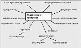 В свою очередь, эргодические цепи могут быть регулярными или циклическими. Циклические цепи отличаются от регулярных тем, что в процессе переходов через определенное количество шагов (циклов) происходит возврат в какое-либо состояние. Регулярные цепи этим свойством не обладают. Если просуммировать все вышесказанные определения, то можно дать следующую классификацию марковских процессов (рис. 9):