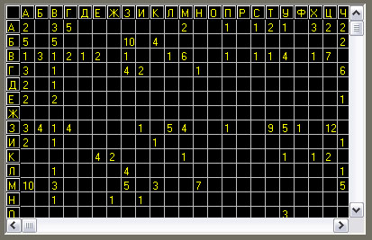 Обратим внимание на символ [9,14] – Ю. Очевидно, это предлог. Биграмма ЮЗ встречается чаще других, следовательно Ю – это согласная (из таблице о встречаемости букв в тексте). Согласные предлоги – это В, К, С. Из той же таблицы видно, что биграмма ВО и КО наиболее частые. Символ Ю – это либо В, либо К. Заметим, что биграмма ИК есть в таблице о встречаемости букв в тексте, ИВ – нет. Заменим Ю на К.