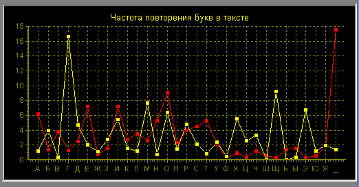 Лидер по числу повторений символ «Г». Естественно предположить, что он заменяет символ пробел «_» открытого текста. Второй по частоте символ – буква «О». Символ «Щ» заменим на – «О».
