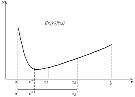 Пусть функция f(x) определена на отрезке [a, b]. Функция f(x) называется унимодальной, если на этом отрезке имеется единственная точка x* локального минимума функции f(x), причем функция строго убывает при x £ x* и строго возрастает при x ³ x*. Многие алгоритмы минимизации функции одной переменной построены в предположении, что функция унимодальна на некотором отрезке. Этот отрезок будем называть отрезком локализации точки x*.