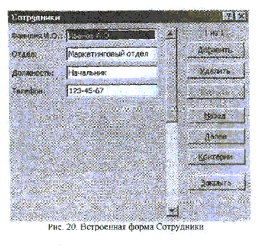На экране появится встроенная форма с надписями из строки заголовка и полями для ввода, заполненными информацией из первой строки списка (см. рис.20).