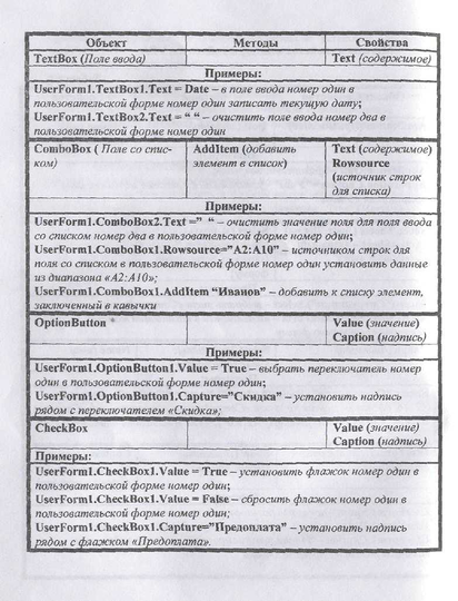 • UserForml.CheckBoxl.Value = True - установить флажок номер один в пользовательской форме номер один.