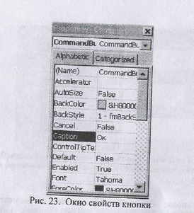 • Для изменения надписи на кнопке в форме выделите эту кнопку, вызовите окно свойств, выполнив команду View- Properties Window