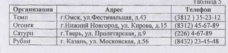 Для ввода информации в базу данных «Организации» сведения представлены в табл. 5.