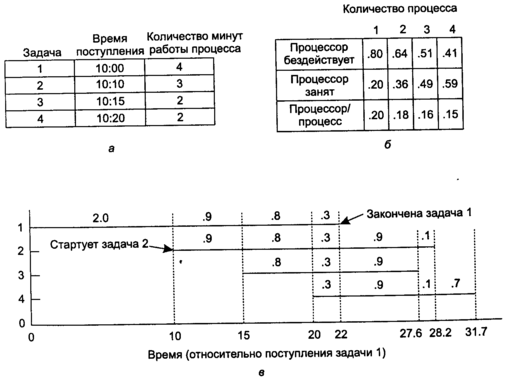 Описанную выше модель также можно применить для анализа систем пакетной обработки. Например, рассмотрим компьютерный центр, в котором среднее время ожидания ввода-вывода задачами равно 80 %. Однажды утром подаются на выполнение 4 задания, как показано на рис. 4.4, а. Первая задача, поступившая в 10 утра, требует 4 мин работы процессора. Тогда при 80 % времени ожидания ввода-вывода за каждую минуту своего нахождения в памяти задача использует только 12 с времени процессора, даже если нет никаких других параллельных заданий, также желающих занять процессор. Остальные 48 с процесс проводит в ожидании ввода-вывода. Таким образом, задача должна находиться в памяти по крайней мере 20 мин для того, чтобы процессор сделал работу, требующую на самом деле всего 4 мин, и это все при отсутствии конкуренции на право использования процессора.