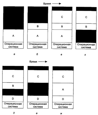 абота системы свопинга проиллюстрирована на рис. 4.5. На начальной стадии в памяти находится только процесс А. Затем создаются или загружаются с диска процессы В и С. На рис. 4.5, г процесс А выгружается на диск. Затем появляется процесс D, а процесс В завершается. Наконец, процесс А снова возвращается в память. Так как теперь процесс А имеет другое размещение в памяти, его адреса должны быть перенастроены или программно во время загрузки в память, или (более заманчивый вариант) аппаратно во время выполнения программы.