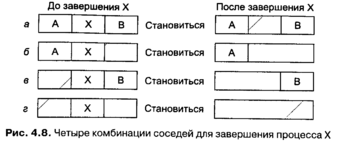 Соседями могут быть процессы или свободные фрагменты, что приводит к четырем комбинациям, показанным на рис. 4.8. процессов для завершившегося процесса обычно будет непосредственно указывать на запись в списке для этого процесса, возможно, удобнее иметь список с двумя связями, чем с одной (последний показан на рис. 4.7, в). Такая структура упрощает поиск предыдущей записи и оценку возможности соединения.