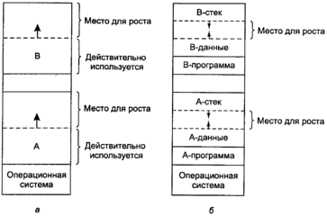 Если процесс может иметь два увеличивающихся сегмента, например сегмент данных, используемый как куча для динамически назначаемых и освобождаемых переменных, и сегмент стека для обычных локальных переменных и возвращаемых адресов, предлагается альтернативная схема распределения памяти, показанная на рис. 4.6, б. Здесь мы видим, что у каждого процесса вверху предоставленной ему области памяти находится стек, который расширяется вниз, и сегмент данных, расположенный отдельно от текста программы, который увеличивается вверх. Область памяти между ними разрешено использовать для любого сегмента. Если ее становится недостаточно, то процесс нужно или перенести на другое, большее свободное место, или выгрузить на диск до появления свободного пространства необходимого размера, или уничтожить.