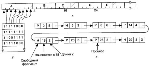 ис. 4.7. Часть памяти с пятью процессами и тремя свободными областями (а);соответствующая битовая карта (б); та же информация в виде списка (в)