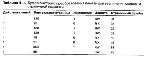 В результате принятого решения компьютер снабжается небольшим аппаратным устройством, служащим для отображения виртуальных адресов в физические без прохода по таблице страниц. Это устройство, называемое буфером быстрого преобразования адреса (TLB — Translation Lookaside Buffer) или иногда ассоциативной памятью, продемонстрировано в табл. 4.1. Оно обычно находится внутри диспетчера памяти и состоит из нескольких записей. В этом примере их восемь, но фактически записей редко бывает больше 64. Каждая запись содержит информацию об одной странице, а именно: номер виртуальной страницы, бит, устанавливаемый при изменении страницы, код защиты (разрешения на чтение/ запись/выполнение) и номер физического страничного блока, в котором расположена эта страница. Эти поля однозначно соответствуют полям в таблице страниц. Еще один бит служит признаком того, действительна ли запись (то есть используется ли она в данный момент) или нет.