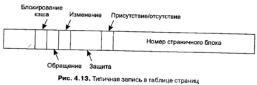 Теперь от структуры таблиц страниц в целом мы перейдем к деталям отдельного элемента записи таблицы. Точная структура элемента в значительной мере зависит от машины, но виды представленной информации примерно одни и те же. На рис. 4.13 мы привели образец записи в таблице страниц. Ее длина изменяется от компьютера к компьютеру, но 32 бита — это наиболее распространенный размер. Наиболее важным полем является Номер страничного блока. Прежде всего, задачей отображения страниц является определение этой величины. За этим полем следует бит Присутствия/отсутствия. Если этот бит равен 1, запись имеет силу и может использоваться. Если он равен 0, виртуальная страница, которой соответствует эта запись, в данный момент отсутствует в памяти. Обращение к записи в таблице страниц, у которой этому биту присвоено нулевое значение, приводит к страничному прерыванию.