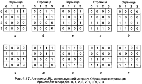 Теперь рассмотрим второй вариант аппаратной реализации алгоритма LRU. На машине с п страничными блоками оборудование LRU может поддерживать матрицу п х п бит, изначально равных нулю. Всякий раз, когда происходит обращение к страничному блоку k, аппаратура сначала присваивает всем битам строки k значение 1, затем приравнивает к нулю все биты столбца k. В любой момент времени строка, двоичное значение которой наименьшее, является не использовавшейся дольше всего. Работа этого алгоритма продемонстрирована на рис. 4.17, где рассматриваются четыре страничных блока и следующий порядок обращения к страницам: