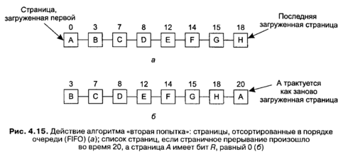 лгоритм «вторая попытка» ищет в списке самую старую страницу, к которой не было обращений в предыдущем временном интервале. Если же происходили ссылки на все страницы, то «вторая попытка» превращается в обычный алгоритм FIFO. Представьте, что у всех страниц на рис. 4.15, а бит R равен 1. Одну за другой передвигает операционная система страницы в конец списка, очищая бит R каждый раз, когда она перемещает страницу в хвост. Наконец, она вернется к странице A, но теперь уже ее биту R присвоено значение 0. В этот момент страница А выгружается из памяти. Таким образом, алгоритм всегда успешно завершает свою работу.