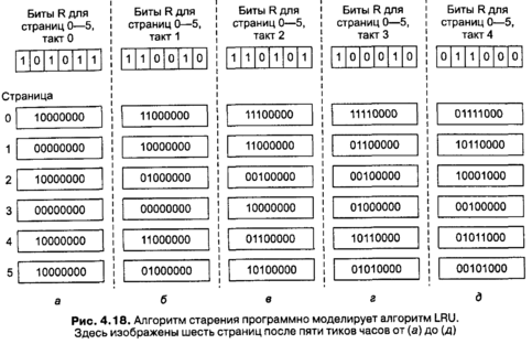 Когда происходит страничное прерывание, удаляется та страница, чей счетчик имеет наименьшую величину. Ясно, что счетчик страницы, к которой не было обращений, скажем, за четыре тика, будет начинаться с четырех нулей и, таким образом, иметь более низкое значение, чем счетчик страницы, на которую не ссылались в течение только трех тиков часов.