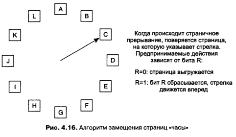 огда происходит страничное прерывание, проверяется та страница, на которую направлена стрелка. Если ее бит R равен 0, страница выгружается, на ее место в часовой круг встает новая страница, а стрелка сдвигается вперед на одну позицию. Если бит R равен 1, то он сбрасывается, стрелка перемещается к следующей странице. Этот процесс повторяется до тех пор, пока не находится та страница, у которой бит R = 0. Неудивительно, что этот алгоритм называется <<часы>>. Он отличается от алгоритма «вторая попытка» только своей реализацией.