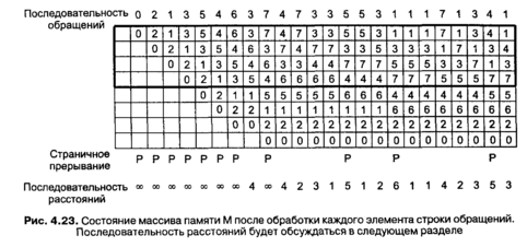 Второе обращение к странице 3 не вызывает страничного прерывания, потому что она уже находится в памяти. Тем не менее интерпретатор убирает ее с того места, где она располагалась, и помещает в верхнюю ячейку столбца, как показано на рисунке. Процесс продолжает работу некоторое время, до тех пор, пока не происходит обращение к странице 5. Эта страница переносится из нижней части массива Мв верхнюю (то есть она загружается в память с диска). Всякий раз, когда страница, к которой обращается процесс, не находится внутри рамки, очерченной жирной линией, происходит страничное прерывание, что отмечено буквами «П» в строке под таблицей.