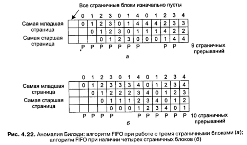 нтуитивно может показаться, что чем больше страничных блоков имеет память, тем меньше будет происходить страничных прерываний. Достаточно удивителен тот факт, что это не всегда так. Билэди (Belady) и другие исследователи в своей работе [23] описали обнаруженный ими контрпример, в котором алгоритм FIFO вызывал больше страничных прерываний при четырех страничных блоках, чем при трех. Эта странная ситуация стала известна как аномалия Билэди. Она проиллюстрирована на рис. 4.22 для программы с пятью виртуальными страницами, пронумерованными от 0 до 4. Буквы «Р» показывают, какие обращения вызывают страничные прерывания. Обращения к страницам происходят в следующем порядке: