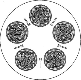 Жизнь философа состоит из чередующихся периодов поглощения пищи и размышлений. (Разумеется, это абстракция, даже применительно к философам, но остальные процессы жизнедеятельности для нашей задачи несущественны.) Когда философ голоден, он пытается получить две вилки, левую и правую, в любом порядке. Если ему удалось получить две вилки, он некоторое время ест, затем кладет вилки обратно и продолжает размышления. Вопрос состоит в следующем: можно ли написать алгоритм, который моделирует эти действия для каждого философа и никогда не застревает? (Кое-кто считает, что необходимость двух вилок выглядит несколько искусственно. Возможно, нам следует заменить итальянскую пищу блюдами китайской кухни, спагетти — рисом, а вилки — соответствующими палочками.)