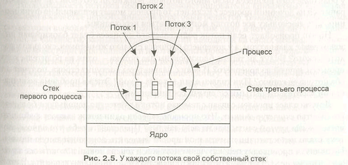 Важно понимать, что у каждого потока свой собственный стек, как показано на рис. 2.5. Стек каждого потока содержит по одному фрейму для каждой процедуры, вызванной, но еще не вернувшей управления. Во фрейме находятся локальные переменные процедуры и адрес возврата. Например, если процедура Х вызывает процедуру Y и она, в свою очередь, вызывает процедуру Z, то во время работы процедуры Z в стеке будут находиться фреймы для всех трех процедур. Каждый поток может вызывать различные процедуры и, соответственно, иметь различный протокол выполнения процесса — именно поэтому каждому потоку необходим собственный стек.