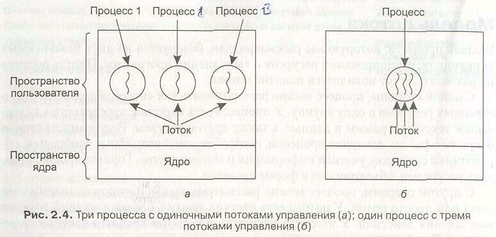 Концепция потоков добавляет к модели процесса возможность одновременного выполнения в одной и той же среде процесса нескольких программ, в достаточной степени независимых. Несколько потоков, работающих параллельно в одном процессе, аналогичны нескольким процессам, идущим параллельно на одном компьютере. В первом случае потоки разделяют адресное пространство, открытые файлы и другие ресурсы. Во втором случае процессы совместно пользуются физической памятью, дисками, принтерами и другими ресурсами. Потоки обладают некоторыми свойствами процессов, поэтому их иногда называют упрощенными процессами. Термин многопоточность также используется для описания использования нескольких потоков в одном процессе.