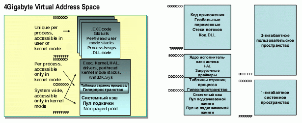 Размер виртуального адресного пространства зависит от конкретной аппаратной платформы. На 32-разрядных х8б-системах теоретический максимум для общего виртуального адресного пространства составляет 4 Гб.