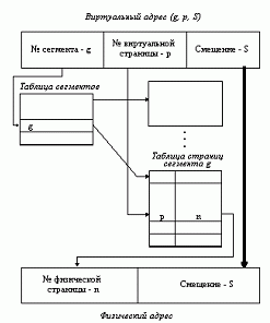 Виртуальное пространство процесса делится на сегменты, а каждый сегмент в свою очередь делится на виртуальные страницы, которые нумеруются в пределах сегмента. Оперативная память делится на физические страницы. Загрузка процесса выполняется операционной системой постранично, при этом часть страниц размещается в оперативной памяти, а часть на диске. Для каждого сегмента создается своя таблица страниц, структура которой полностью совпадает со структурой таблицы страниц, используемой при страничном распределении. Для каждого процесса создается таблица сегментов, в которой указываются адреса таблиц страниц для всех сегментов данного процесса. Адрес таблицы сегментов загружается в специальный регистр процессора, когда активизируется соответствующий процесс.