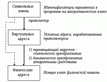 Физические адреса соответствуют номерам ячеек оперативной памяти, где в действительности расположены или будут расположены переменные и команды. Переход от виртуальных адресов к физическим может осуществляться двумя способами. В первом случае замену виртуальных адресов на физические делает специальная системная программа - перемещающий загрузчик. Перемещающий загрузчик на основании имеющихся у него исходных данных о начальном адресе физической памяти, в которую предстоит загружать программу, и информации, предоставленной транслятором об адресно-зависимых константах программы, выполняет загрузку программы, совмещая ее с заменой виртуальных адресов физическими.