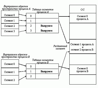 При загрузке процесса часть сегментов помещается в оперативную память (при этом для каждого из этих сегментов операционная система подыскивает подходящий участок свободной памяти), а часть сегментов размещается в дисковой памяти. Сегменты одной программы могут занимать в оперативной памяти несмежные участки. Во время загрузки система создает таблицу сегментов процесса (аналогичную таблице страниц), в которой для каждого сегмента указывается начальный физический адрес сегмента в оперативной памяти, размер сегмента, правила доступа, признак модификации, признак обращения к данному сегменту за последний интервал времени и некоторая другая информация. Если виртуальные адресные пространства нескольких процессов включают один и тот же сегмент, то в таблицах сегментов этих процессов делаются ссылки на один и тот же участок оперативной памяти, в который данный сегмент загружается в единственном экземпляре.