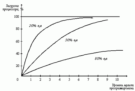 Из рисунка видно, что для загрузки процессора на 90% достаточно всего трех счетных задач. Однако для того, чтобы обеспечить такую же загрузку интерактивными задачами, выполняющими интенсивный ввод-вывод, потребуются десятки таких задач. Необходимым условием для выполнения задачи является загрузка ее в оперативную память, объем которой ограничен. В этих условиях был предложен метод организации вычислительного процесса, называемый свопингом.