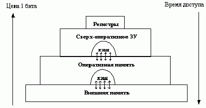 Память вычислительной машины представляет собой иерархию запоминающих устройств (внутренние регистры процессора, различные типы сверхоперативной и оперативной памяти, диски, ленты), отличающихся средним временем доступа и стоимостью хранения данных в расчете на один бит.