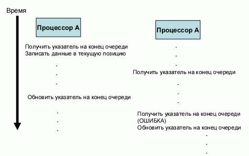 Рис. иллюстрирует, что происходит, когда два потока, выполняемые на разных процессорах, одновременно записывают данные в циклическую очередь.