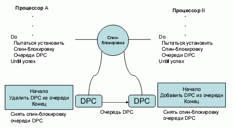 Механизм, применяемый ядром для взаимоисключения в многопроцессорных системах, называется спин-блокировкой (spinlock). Спин-блокировка — это блокирующий примитив, сопоставленный с какой-либо глобальной структурой данных вроде очереди DPC