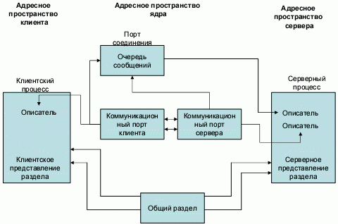 Сообщение длиной менее 256 байтов можно передать вызовом LPC с буфером, содержащим сообщение. Затем это сообщение копируется из адресного пространства процесса-отправителя в системное адресное пространство, а оттуда — в адресное пространство процесса-получателя.