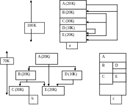 Обычно разные подпрограммы данной программы действительно требуются в разное время; например, первый и второй просмотры ассемблера взаимно исключают друг друга. Используя явное определение того, какая подпрограмма содержит обращения к другим подпрограммам, можно задать так называемую структуру с перекрытием (оверлейную структуру), которая указывает на взаимоисключающие подпрограммы. На рис. 14.4a показана программа, состоящая из пяти подпрограмм (А, В, С, D и Е), для которых в совокупности требуется 100К байтов памяти. Стрелки показывают, что подпрограмма А содержит обращения только к подпрограммам В, D и Е; подпрограмма В - только к подпрограммам С и Е; подпрограмма D - только к Е; подпрограммы С и Е не содержат обращений к другим подпрограммам. На рис. 14.4,6 показана взаимосвязь процедур. Обратите внимание на то, что процедуры В и D никогда не выполняются одновременно, это же справедливо и для процедур С и Е. Если загрузить в память только те процедуры, которые в действительности могут быть использованы в некоторый конкретный момент времени, требуемое количество памяти окажется равным определяемому самой длинной ветвью структуры с перекрытием. Для примера, представленного на рис. 14.4.в, требуемое количество окажется равным 70К байтов (процедуры А, В и С). На рис. 14.4.в показано распределение памяти для всех процедур, участвующих в рассматриваемой структуре с перекрытием.