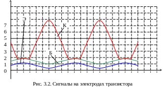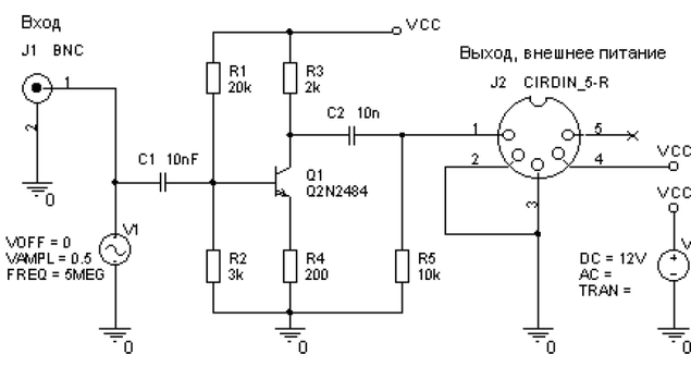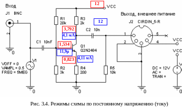 Из рис. 3.2 видно, что исследуемое устройство является усилителем, т.к. сигнал с коллектора транзистора снимается относительно общего провода, то усилитель инвертирует сигнал. Транзистор включен по схеме с ОЭ, имеет стабилизацию рабочей точки резистивным делителем в цепи базы и резистором R4.