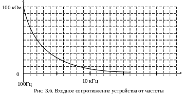 Для этого, не закрывая программу OrCAD PSpise, последовательно выполнить команды меню Trace/Delete All Trace и Trace/Add Trace. (удалить все имеющиеся и добавить новые кривые). В открывшейся таблице выбрать сначала в левом списке параметр V(C1:1) — входное напряжение, затем в правом "/" – знак отношения, и, наконец, снова в левом I(C1) – входной ток. Проверить в нижнем поле с заголовком Trace Expression наличие выражения "V(C1:1) / I(C1)", нажать Ok. По аналогии с предыдущим пунктом задать логарифмический масштаб по вертикали, зарисовать график. График показан на рис. 3.6.