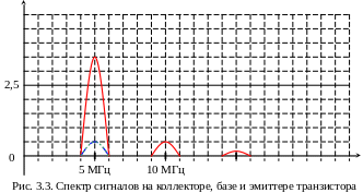 В идеале гармоник на частотах 10 МГц, 15 МГц и т.д. быть недолжно. Они присутствуют именно из-за искажения сигнала. Хотя, иногда это свойство применяют специально: Если после транзистора установить полосовой фильтр на 10 МГц или 15 МГц с полосой пропускания 1…2 МГц, то на выходе фильтра получим сигнал заданной частоты (10 МГц или 15 МГц соответственно). После фильтра можно поставить усилитель гармонических сигналов и далее использовать сигнал более высокой частоты. Иными словами, данный эффект применяется в высокочастотных умножителях частоты.