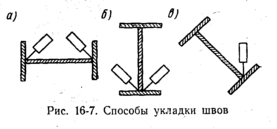 ри изготовлении двутавровых балок основной сварочной операцией является выполнение поясных швов, свариваемых обычно автоматами под слоем флюса. Приемы и последовательность наложения швов могут быть различными. Приемы сварки наклоненным электродом (рис. 16-7, а, б) позволяют одновременно сваривать два шва, однако имеется опасность возникновения подреза стенки или полки.