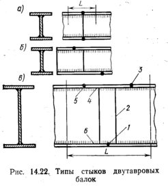При монтаже конструкций нередко возникает необходимость стыковки балок. Типы стыков балок двутаврового сечения показаны на рис. 14.22. Раздвинутый стык (рис. 14.22,6) применяют как технологический. При монтаже обычно используют совмещенный стык (рис. 14.22,а), выполняя его ручной сваркой или полуавтоматом в СО2. Назначая последовательность выполнения швов поясов и стенки, необходимо иметь в виду следующее. Если в первую очередь сварить стыки поясов, то стык стенки придется выполнять в условиях жесткого закрепления, что может способствовать образованию трещин в процессе сварки. Когда вначале сваривают стык стенки, в стыках поясов возникает высокий уровень остаточных напряжений растяжения, что может снизить усталостную прочность при работе на изгиб. Для облегчения условий сварки стыка участки поясных швов балки длиной L (рис. 14.22,а) иногда не доваривают, а выполняют их после сварки стыковых швов. Так как поперечная усадка свариваемого последним шва будет восприниматься элементом длиной L, то значение остаточных напряжений окажется меньше, чем при жестком закреплении. Однако в элементах, свариваемых в первую очередь, появление свободного участка L может вызвать коробление из-за потери устойчивости под напряжением сжатия. Для каждого конкретного случая в зависимости от перечисленных факторов (опасности возникновения трещин при сварке, условий работы стыка балки в конструкции, размеров поперечных сечений элементов) оптимальная технология выполнения стыка может быть различной.